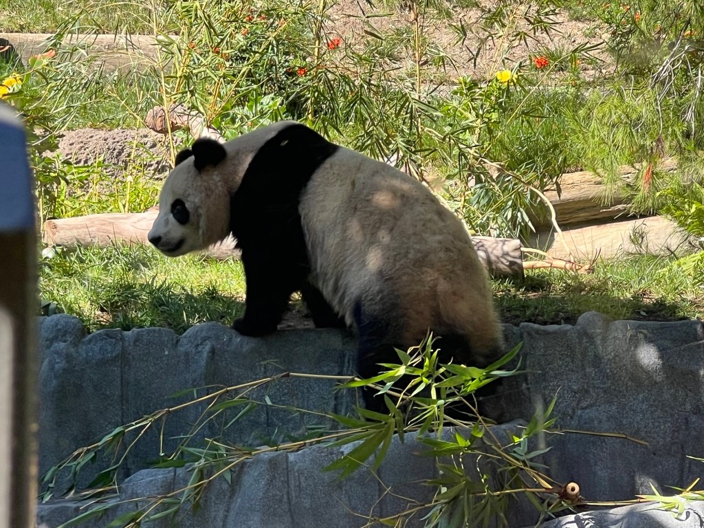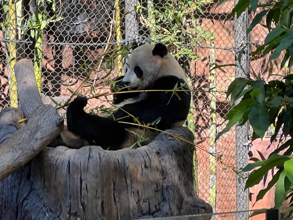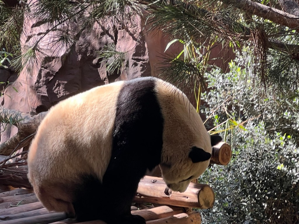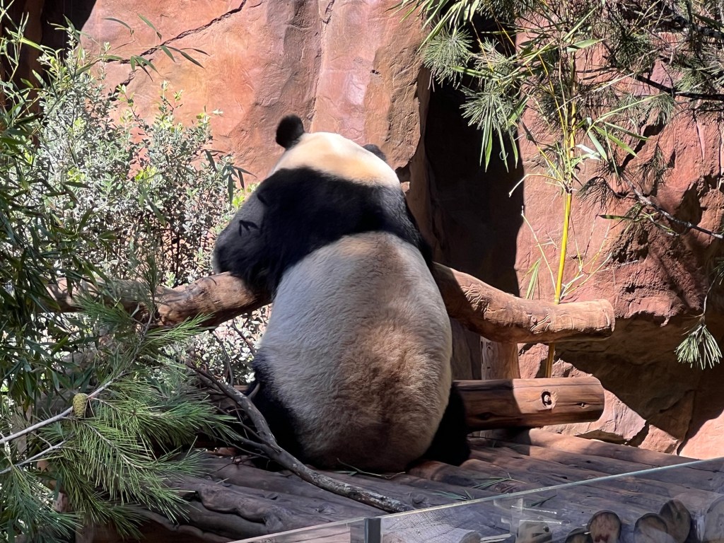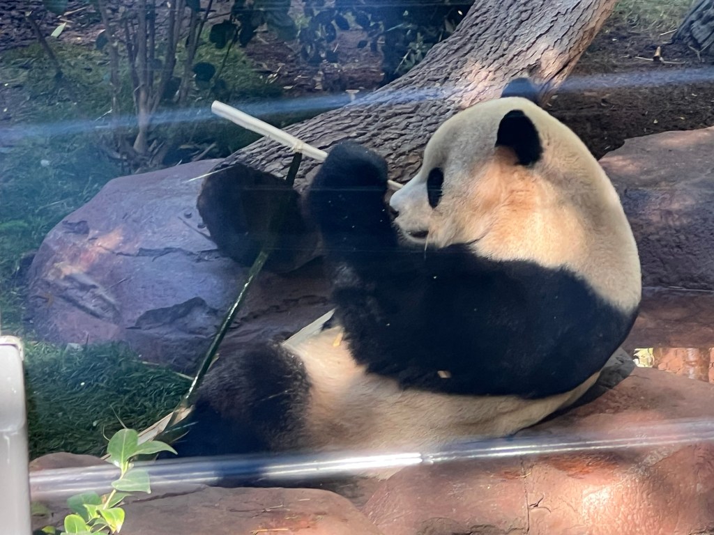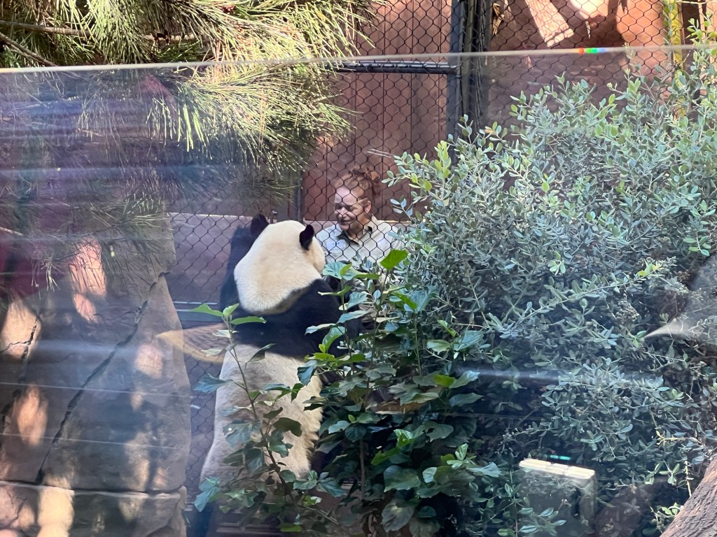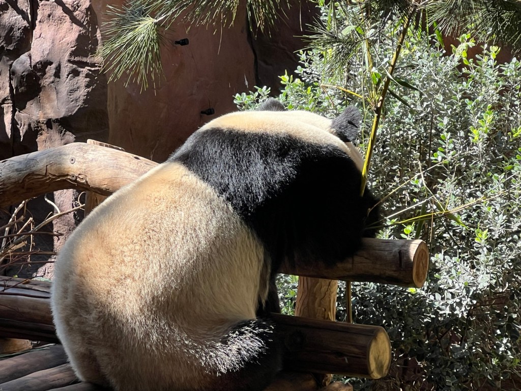 Then I spent some time at the zoo. There was no one in the standby line at 10:30 – I literally walked into the Panda exhibit. Xin Bao was hiding along the back wall of her enclosure, but it was feeding time for Yun Chuan who was released after his bamboo was in position.