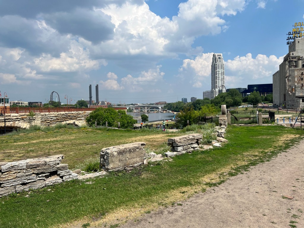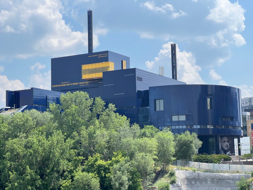 We crossed the bridge to the Mill District (“Mill City”), which has been home to sawmills, flour mills and textile mills. It is currently home to Mill City Museum, Mill Ruins Park, North Star Woolen Mill building, the Guthrie Theater and Gold Medal Park.