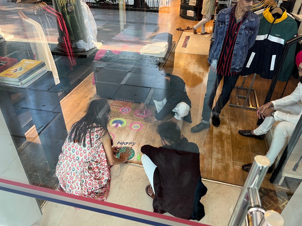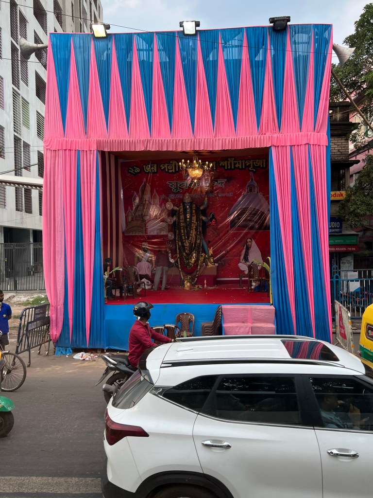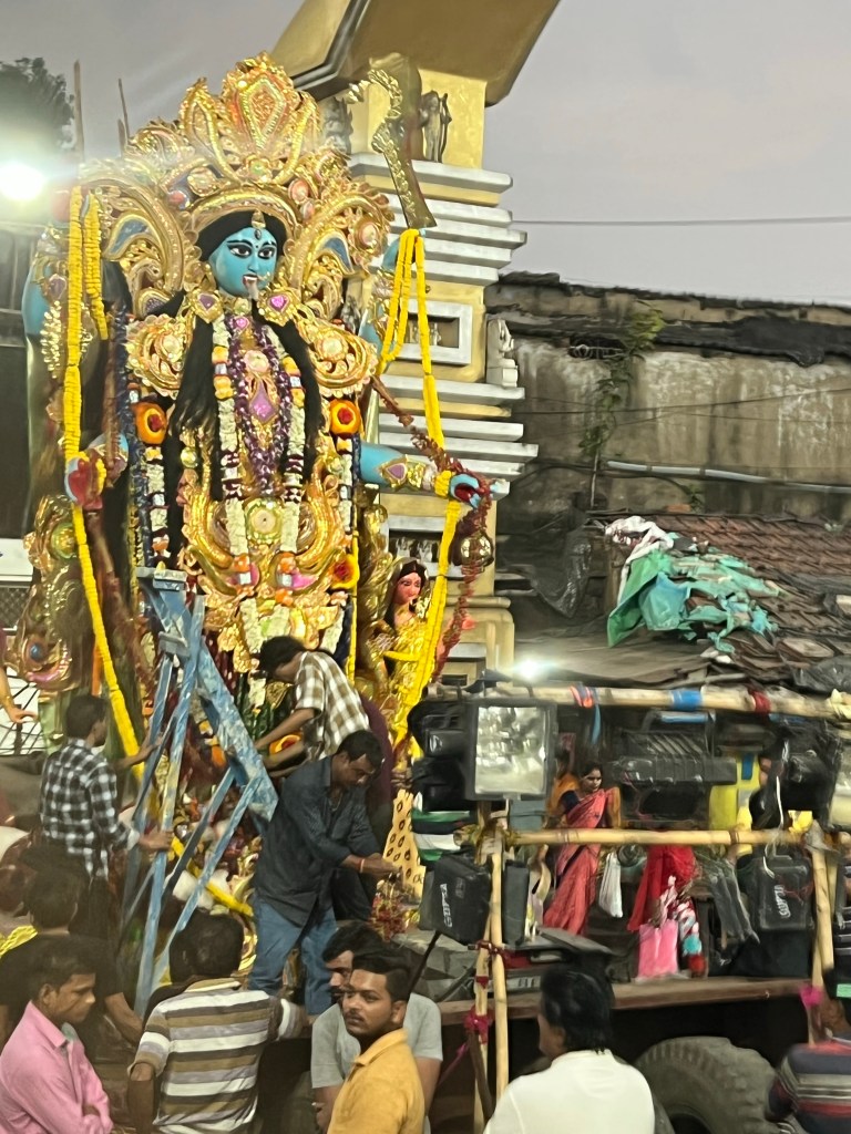 Diwali is celebrated nationwide. In Kolkata, bamboo structures are erected to hold lights. Also, temporary temples are erected to house Kali statues (rice straw, covered with mud, and then painted). The Kali Puja ceremony, where statues are taken to the river for immersion, is typically performed on the full moon night of Diwali,m. This year the full moon was on Tuesday which is the night of the mother goddess, and some devout followers wait an extra night to perform the ceremony.