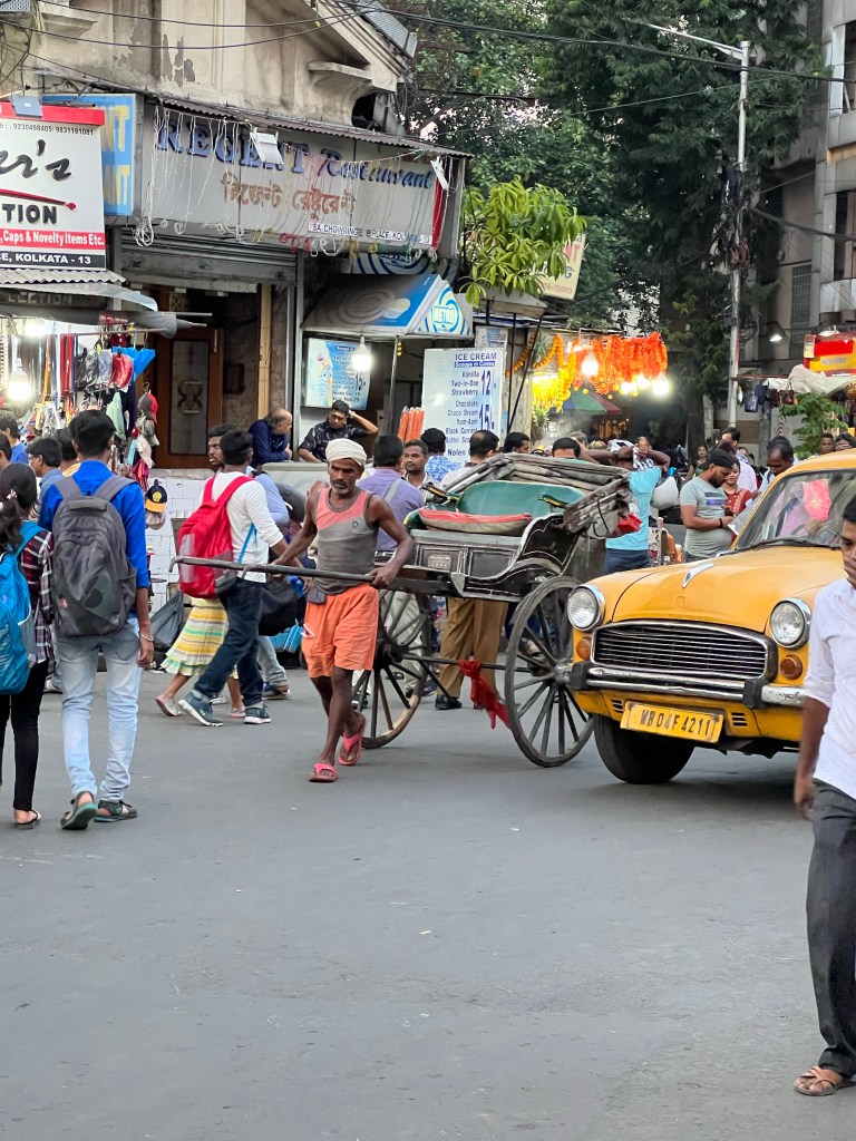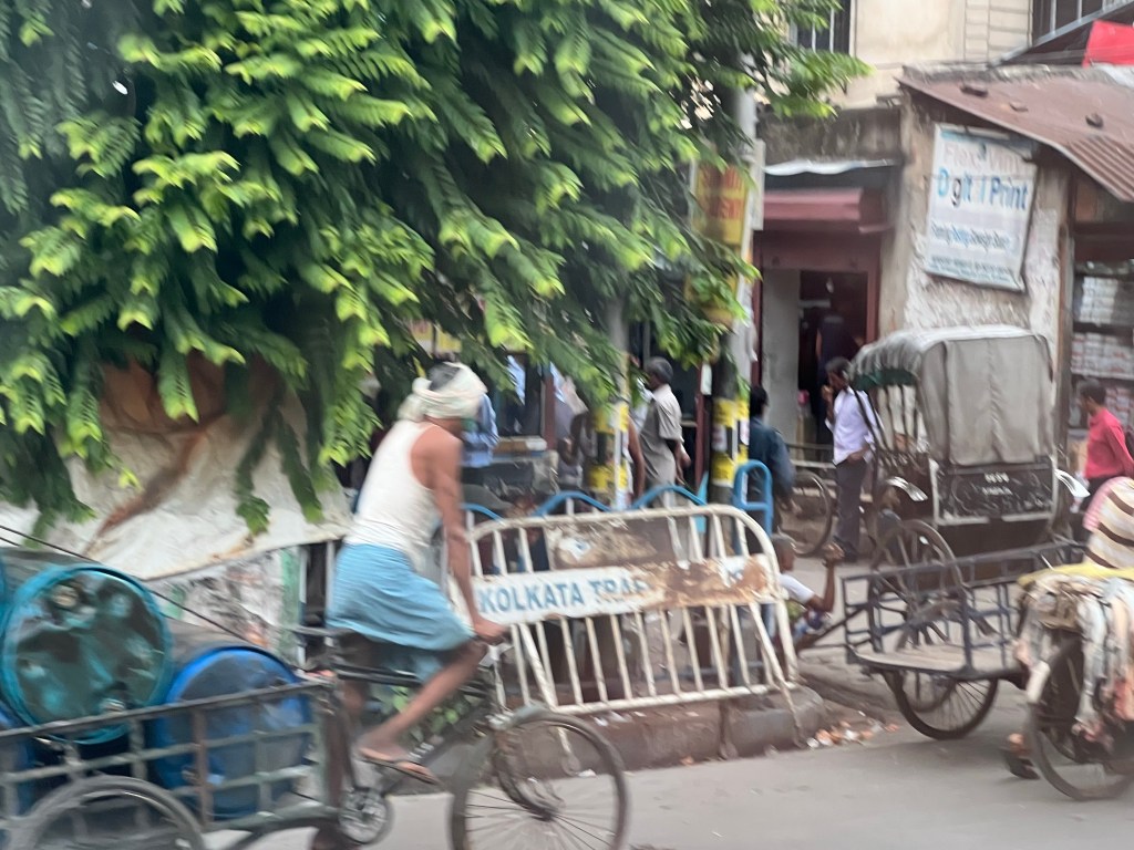 On our drive through the city we saw old Austin cabs, totos (tuk tuks), and rickshaws. There are still approximately 10,000 man-drawn rickshaws in Kolkata. We also saw some marriage carriages and even a man riding a horse.